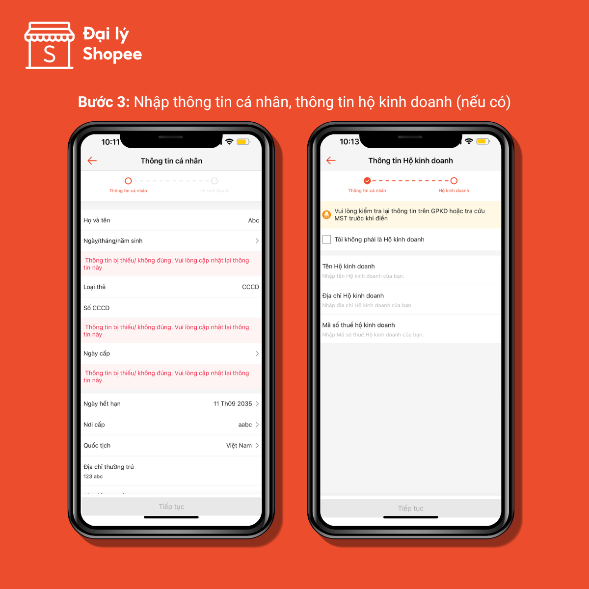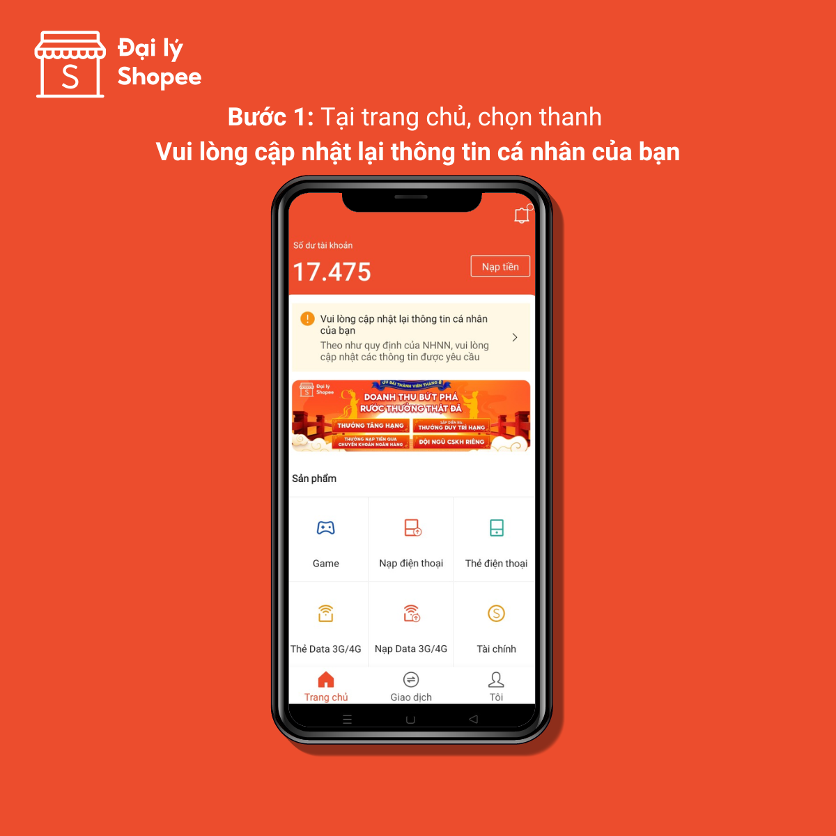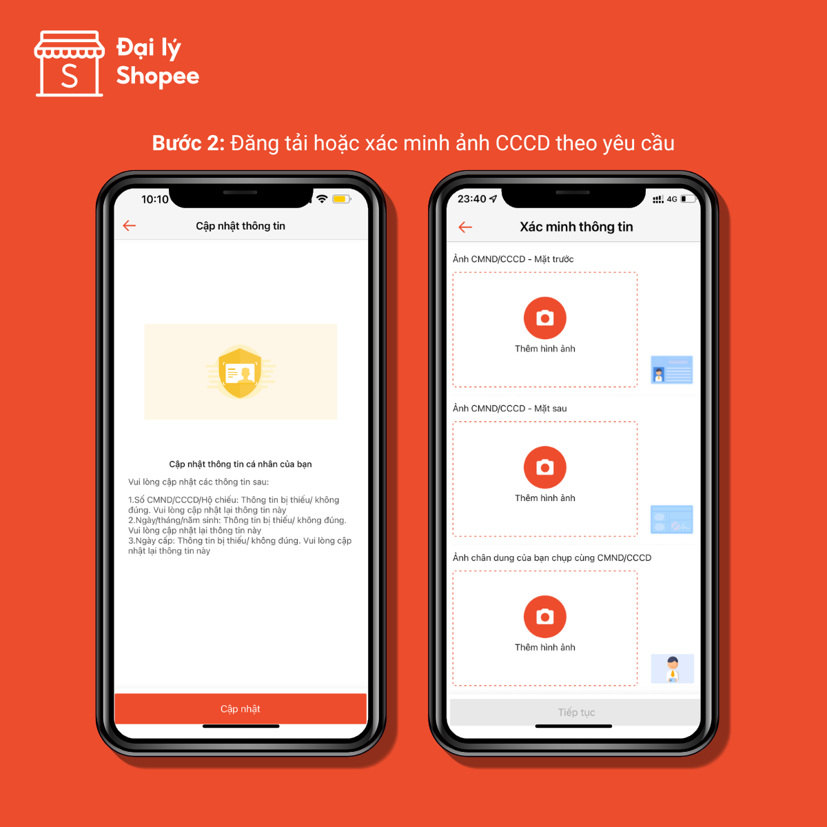Theo quy định của Ngân hàng Nhà Nước, để tiếp tục sử dụng Đạ lý Shopee, Quý Đại lý cần cập nhật các thông tin còn thiếu như hình ảnh, nơi cấp CCCD, địa chỉ thường trú/tạm trú,...Vui lòng nhập CHÍNH XÁC thông tin như trên CCCD để quá trình xác minh được nhanh chóng.