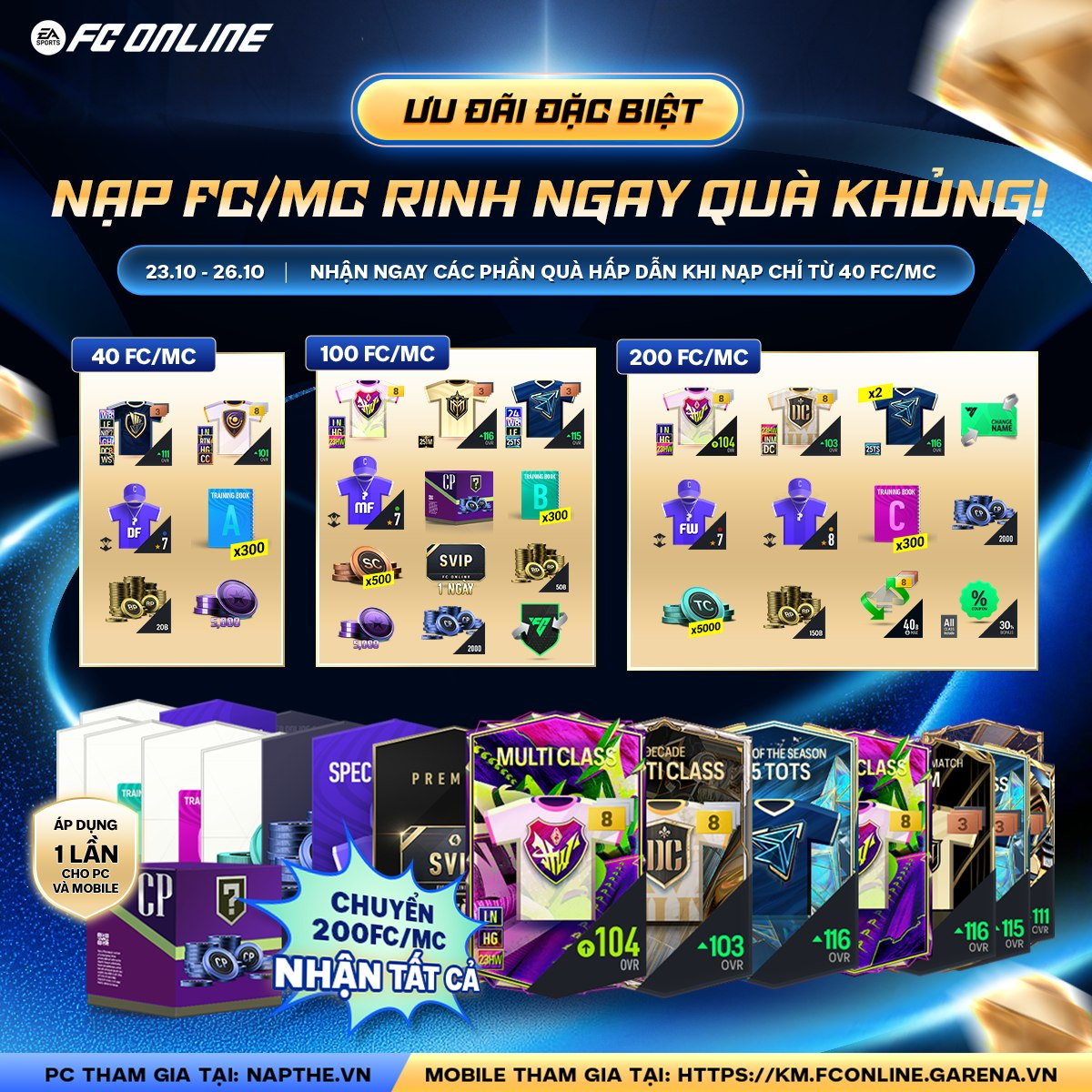 Khi đạt mốc 200 FC/MC, các HLV sẽ có cơ hội nhận được các siêu phẩm hoàn toàn mới hiện nay như 25TOTS, 25IM, WS, DCB với 2 Gói 25TOTS 116+, Gói 25IM 116+ (1~3), Gói WS, DCB, CH, No.7, LE, WB 111+ (1~3),...Chi tiết xem tại đây