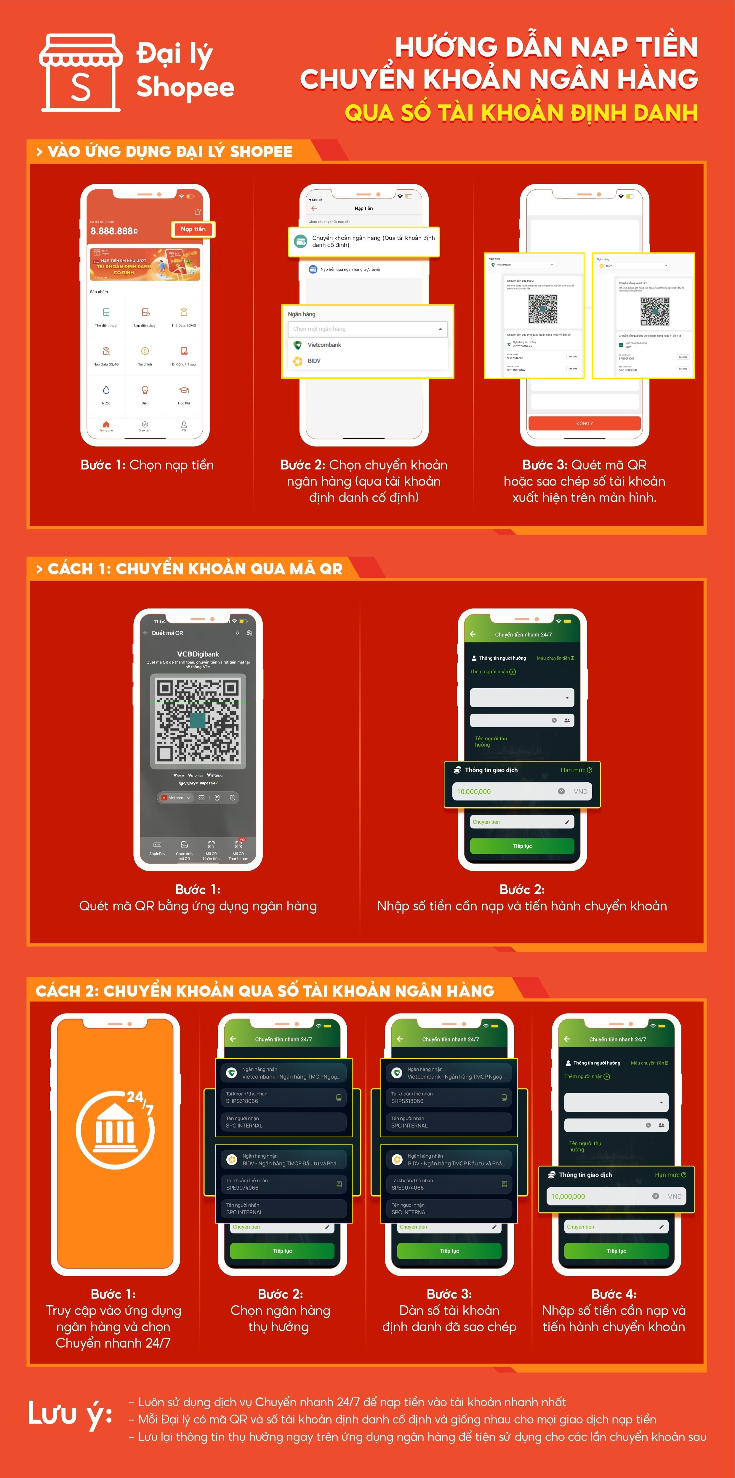 Nhằm mang đến trải nghiệm thuận tiện hơn và phù hợp với nhu cầu kinh doanh đa dạng, Đại lý Shopee chính thức bổ sung tính năng nạp tiền qua chuyển khoản ngân hàng bằng số tài khoản định danh cố định của ngân hàng Vietcombank.